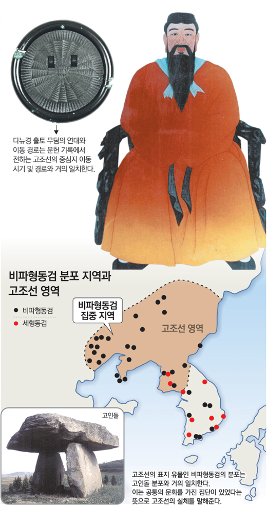 이 교수의 분석에 따르면 다뉴경이 출토된 무덤은 기원전 8세기 대릉하 유역 중류에서 처음 형성돼 △기원전 5, 6세기 요하 중류 지역 △기원전 3, 4세기 압록강, 대동강 유역 △기원전 2세기경 영산강 유역으로 확대됐다. 이 교수는 “문헌 기록에서 전하는 고조선의 중심지 이동 시기와 경로가 다뉴경 출토 무덤의 이동 경로와 맞아떨어진다”고 밝혔다.