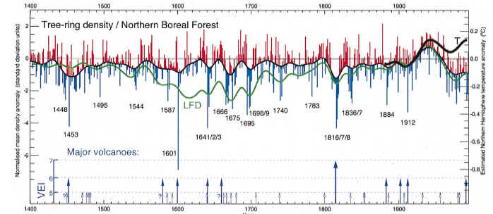 화산폭발이 북반구의 여름 기후와의 상관관계를 보여주는 그림. 그림 아래의 VEI(Volcanic Explosivity Index)는 화산폭발의 규모를 나타낸다. / K. R. Briffa, Ibid (1998), p.451