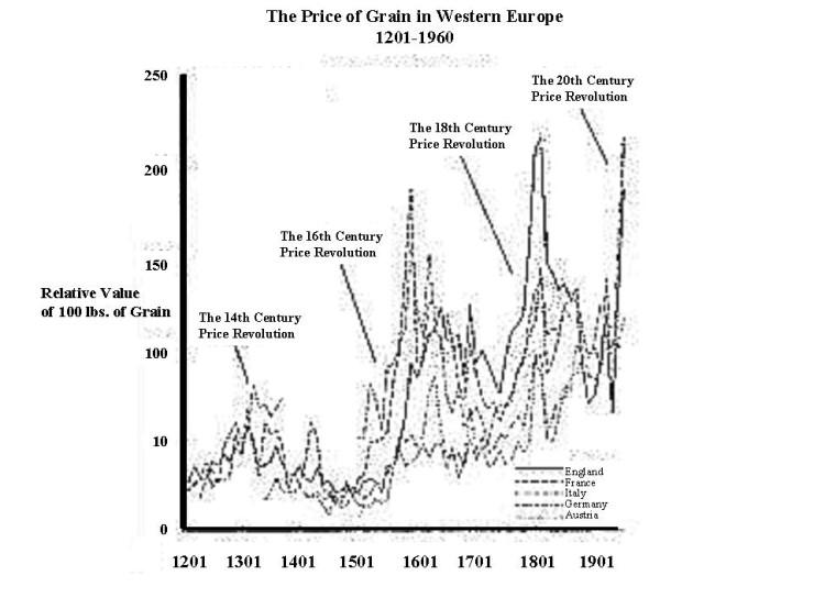 <1201년부터 1960년까지 서유럽의 곡물가 변화 추이> 장기적으로 상승하는 경향을 보이는 빵 가격을 두고 경제사학자들은 ‘가격혁명’이라 불렀다. 그런데 가격상승의 배경은 화폐의 가치절하가 아니라 장기간에 걸쳐 늘어난 빵의 수요였다. 인구는 곡식 생산량보다 더 빠르게 성장했다.