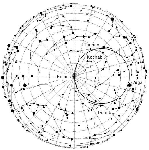 세차운동으로 인한 자전축의 경로로 약26,000년 주기로 회전한다. 고대 문명이 발생하던 시기에는 용자리의 으뜸별 투반(Thuban)이 북극성이었으며, 기원전 1500년에서 서기 500년경까지는 작은곰자리의 베타(β)별 코카브(Kochab)가 북극성으로 불렸었다. 그 후 지금까지 약 1500년 동안은 현재의 북극성(Polaris)이 하늘의 북극에 가장 가까이 있는 별이다. 앞으로 1000년 정도가 지나면 케페이드자리의 에라이(Errai)가 북극성이 될 것이고, 약 1만 2000년 후에는 거문고자리의 으뜸별인 직녀성(Vega)이 새로운 북극성이 될 것이다.