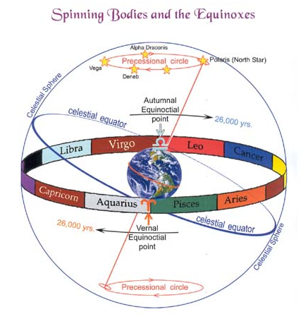 거대한 주기를 갖는 이 세차의 일부분이 서양의 달력에 사용된 것은 본디 인류의 서로 다른 시대를 상징하기 위해서였다. 2만6000년의 12분의 1 또는 거의 2200년에 해당하는 각 시대는 춘분점이 황도대의 새로운 집, 즉 새로운 별자리에 들어가는 것으로 표시되었으며, 그 시대에 대한 인식은 신화 창조와 신화의 재창조를 관통해 흐르고 있었다.이런 식으로 해서 기독교 시대는 춘분점이 물고기자리에 있고, 그 물고기자리에서 태양이 떠오를 때 시작되었다. 이에 앞선 양자리 시대는 모세가 시나이 산에 도착한 때였다. 또 그 이전 황소자리 시대에는 사람들이 황금 송아지 또는 황소자리 그 자체를 경배했는데, 이는 에게 문명의 중심지였던 크레타 섬의 오래된 도읍 크노소스 궁 안의 미노아 건축물뿐 아니라 이집트의 특정 신들이 착용한 머리장식의 상징에서도 찾아볼 수 있다.
