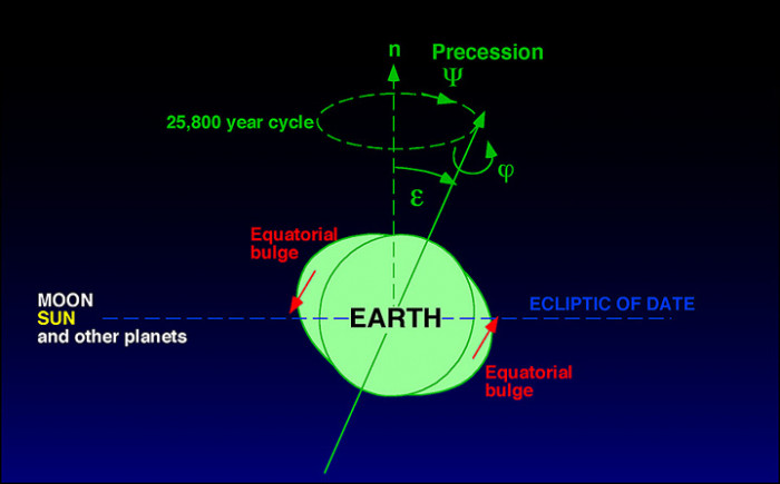 지구의 경우 자전에 의하여 지구 적도 부근이 위의 그림과 같이 불룩해지고 이 불룩한 부분이 달 또는 태양에 의하여 중력을 받는데 그림의 A지점이 받는 힘이 B지점이 받는 힘보다 크므로 지구의 자전축은 그림과 같이 반시계방향으로 황극축을 따라 회전하게 된다. 회전주기는 25800년이다. 따라서 북극의 위치가 바뀌게 되는데 현재는 북극성의 위치가 북극이지만 13000년이 지나면 북극의 위치는 대략 직녀성 근처가 될 것이다.