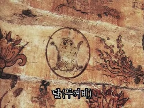 "《山海經 大荒東經》: 湯谷上有扶木. 一日方至, 一日方出, 皆載于烏 " "《산해경 대황동경》: 탕곡 위에 부목이 있다. 한 개의 태양이 오면, 한 개의 태양이 나간다. 까마귀가 해를 운반한다 " 동이(東夷)는 근본적으로 태양을 숭배하였다. 그리고 神과 사람이 소통하는 수단으로 새를 신표로 삼았다. 솟대가 그 좋은 예이다. 그러므로 태양 속에 까마귀를 그린 것이다. 이른바 삼족오는 태양 속에 사는 새이며 양(陽)의 기운을 대표하는 새이므로 양의 수(홀수)로서 발을 세 개로 한 것이다. 반대로 달은 음(陰)의 기운이 가득하여 음(陰)을 상징하는 대표적 동물인 두꺼비를 그렸다. 두꺼비는 후손를 많이 낳으므로 다산의 상징이기도 하다.