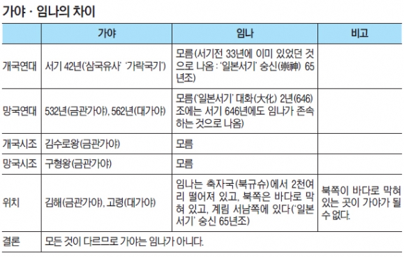 ●가야는 임나가 아니라는 반론김 교수는 “왜에서는 무슨 이유에선가”라고 넘어갔지만 ‘무슨 이유’로 그렇게 말하는지 그 근거를 밝히는 것이 역사학이다.그러나 ‘삼국사기’와 ‘삼국유사’는 말할 것도 없고 일본 측 기록인 ‘일본서기’에도 가야를 임나라고 표현한 기사는 한 군데도 없다. 억지해석만이 난무할 뿐이다. ‘낙랑군=평양’이라는 사료적 근거가 전무한 것처럼 ‘가야=임나’라는 사료적 근거도 없는 것이다. 그래서 최 교수의 비판은 기본적인 의문으로 이어진다.최 교수는 같은 책에서 “이러한 일본인들의 주장에 어찌하여 한국 사학자들도 무조건 동조하며 가야와 임나가 동일국이라고 주장하는지 모르겠다. 또 일본인들은 가야와 임나의 관계에 대하여 논할 때는 보통 가야와 임나가 동일국이라고 주장함과 동시에 일본이 가야를 지배하였다고 주장한다. 그런데 또 어찌하여 한국의 고대사학자들은 후자인 일본이 가야(한국)를 지배하였다는 주장에 대해서는 놀라울 정도로 침묵을 지키면서 전자인 가야와 임나가 동일국이라는 대목에만 관심을 가져 이것을 받아들이는지 모르겠다”고 했다.최 교수의 이 말이야말로 현재 ‘가야=임나’를 주장하는 남한 사학계의 이중적 태도를 잘 지적한 것이다. 또한 정부는 돈만 대고 연구는 자신들에게 맡기라고 말할 수밖에 없는 속내를 미리 간파한 혜안이기도 하다.●계림은 신라의 별칭임나는 과연 가야의 별칭일까. 이 문제를 명쾌하게 정리하지 않으면 가야사 전체의 모습이 흩어지게 되어 있다. 임나가 가야의 별칭이라는 말은 가야가 곧 임나라는 말이다. ‘가야=임나설’이 사실로 성립할 수 있을지 역사학적 방법론에 따라서 살펴보자.가야와 깊은 관계가 있는 나라는 신라다. 그런데 “계림은 신라의 별칭이다”라는 말에는 아무도 시비하지 않는다. ‘삼국사기’의 신라본기에 ‘탈해 이사금 9년(서기 65년)조에는 금성(金城) 서쪽 시림(始林) 나무 사이에서 금궤짝이 나무에 걸려 있고, 흰 닭이 그 아래에서 울고 있었다’고 말한다. 그 금궤짝에서 한 아이가 나왔으므로 성을 김씨라고 하고 “시림을 계림(鷄林)으로 고치고 국호로 삼았다”는 것이다.신라인들 스스로 신라를 계림으로 여겼다는 뜻이다. 중국 당나라의 정사(正史)인 ‘신당서’(新唐書) 고종(高宗) 상원(上元) 원년(674)조에는 “유인궤(劉仁軌)를 계림도(林道) 행군대총관으로 삼아 신라를 정벌하게 했다”고 기록하고 있다. 신라·당 전쟁 시기(670~676)의 기사인데, 당나라도 신라를 계림으로 인식했다는 뜻이다.따라서 ‘계림이 신라의 별칭’이라는 말에는 아무도 시비하지 않는다. ‘임나가 가야의 별칭’이라는 명제도 마찬가지일까.●가야와 임나는 모든 것이 다르다‘임나가 가야의 별칭’이라는 말은 ‘삼국사기’와 ‘삼국유사’에 나오는 ‘가야’가 ‘일본서기’에 나오는 ‘임나’와 같은 나라라는 뜻이다. 임나를 가야의 별칭이라고 말하려면 몇 가지 핵심적인 사실들이 일치해야 한다. 개국연대와 멸망연대가 일치해야 하고 개국시조와 망국시조가 일치해야 한다. 또한 나라가 있었던 지리적 위치도 일치해야 한다.그러나 <표>에서 보는 것처럼 ‘삼국사기’와 ‘삼국유사’의 가야와 ‘일본서기’의 임나는 이 모든 것이 다 다르다. 아니 다르다기보다는 ‘일본서기’의 임나에는 개국연대, 망국연대, 개국시조, 망국시조 같은 내용이 일절 나오지 않는다. 그래서 최 교수가 “가야와 임나가 동일국이라는 증거는 하나도 제시함이 없이 말로만 가야와 임나는 동일국이라고 주장하고 있다”고 비판한 것이다.