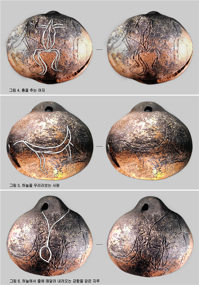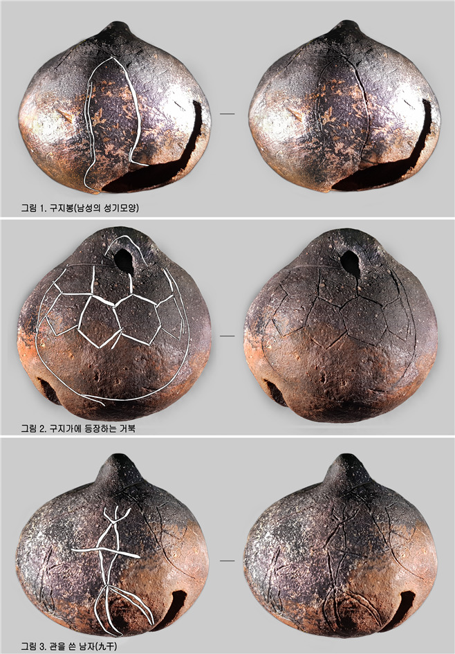 대가야의 토제 구슬에 새겨진 미지의 그림들.토제방울이 나온 석곽묘에서는 이외에 소형 토기 6점, 쇠 낫 1점, 화살촉 3점, 곱은옥(曲玉) 1점 등과 아이의 이빨, 두개골 조각들도 나왔다. 묻힌 토기나 철기가 대가야산인 것으로 미뤄 생활용품으로 제작된 토제방울 역시 대가야 것으로 추정된다고 한다. 배성혁 연구원 조사실장은 “발굴한지 열흘도 채 되지 않은 시점이라 학계 관계자들한테서 상세한 자문을 받은 것은 아니다. 하지만 방울 표면의 도상들을 면밀히 관찰한 결과 <구지가>를 비롯한 건국신화의 이야기들을 풀어내고 있다는 결론에 이를 수 있었다”고 말했다.