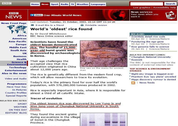 | ▲ BBC 뉴스(인터넷판)에 소개된 "세계 최고의 벼가 발견되다"(2013.10.21) |
