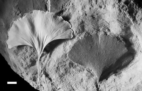 살아있는 현재의 은행나무 잎(왼쪽)과 은행나무 잎 화석(오른쪽). 이 같은 나뭇잎의 기공 밀도는 과거의 대기 중 이산화탄소 농도를 알 수 있는 대체물(proxy)이다. Credit : Dana Royer